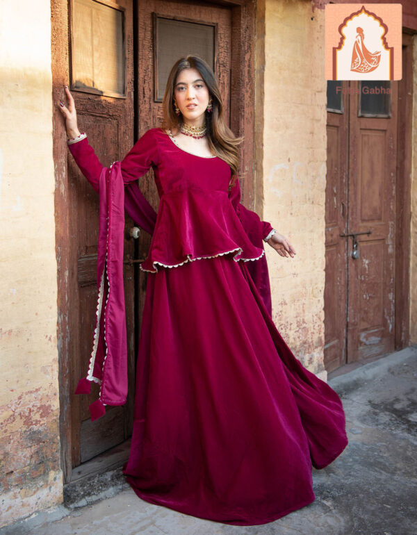 Magenta Pink Velvet Kurta Set with Skirt and Dupatta