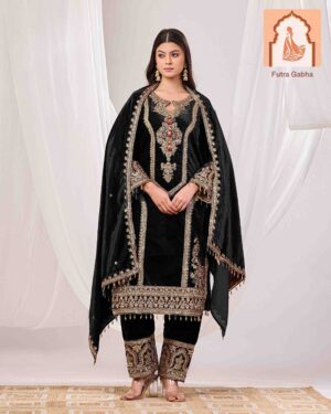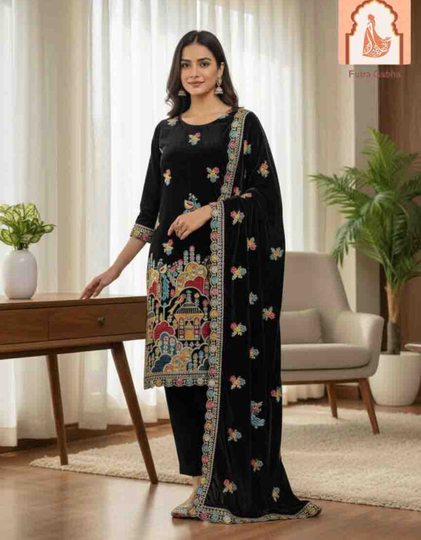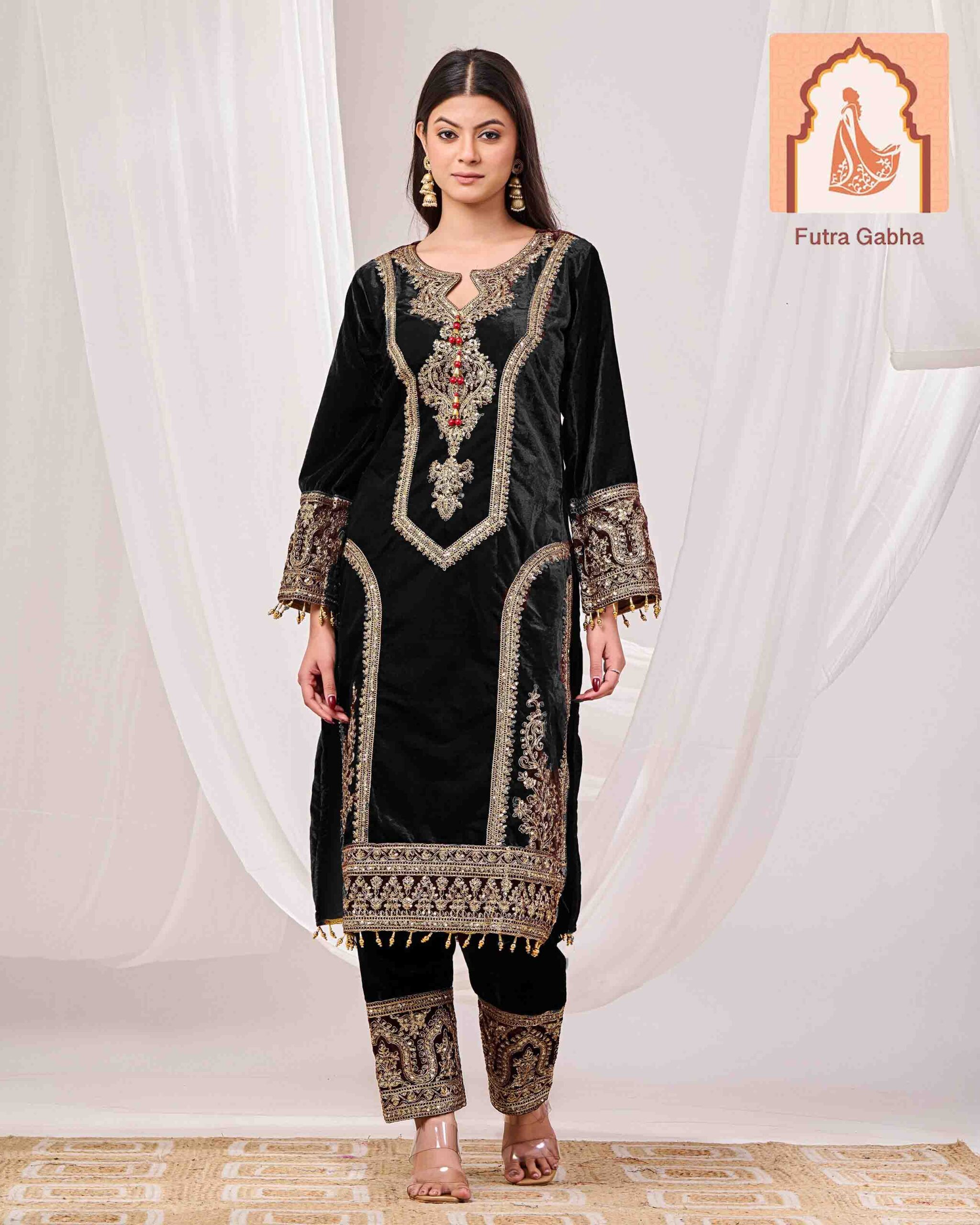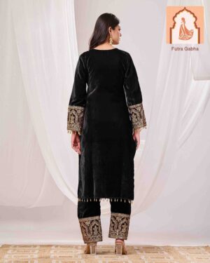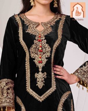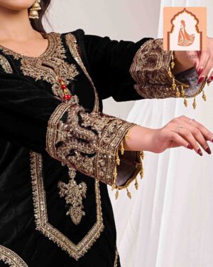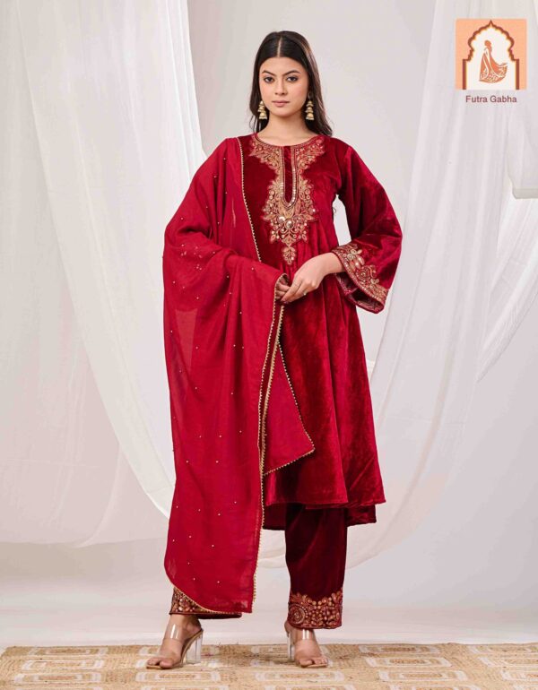 – Style Note: Make a warm and elegant statement with this luxurious brown velvet suit set, featuring a stylish top and bottom, paired with a rich velvet dupatta.