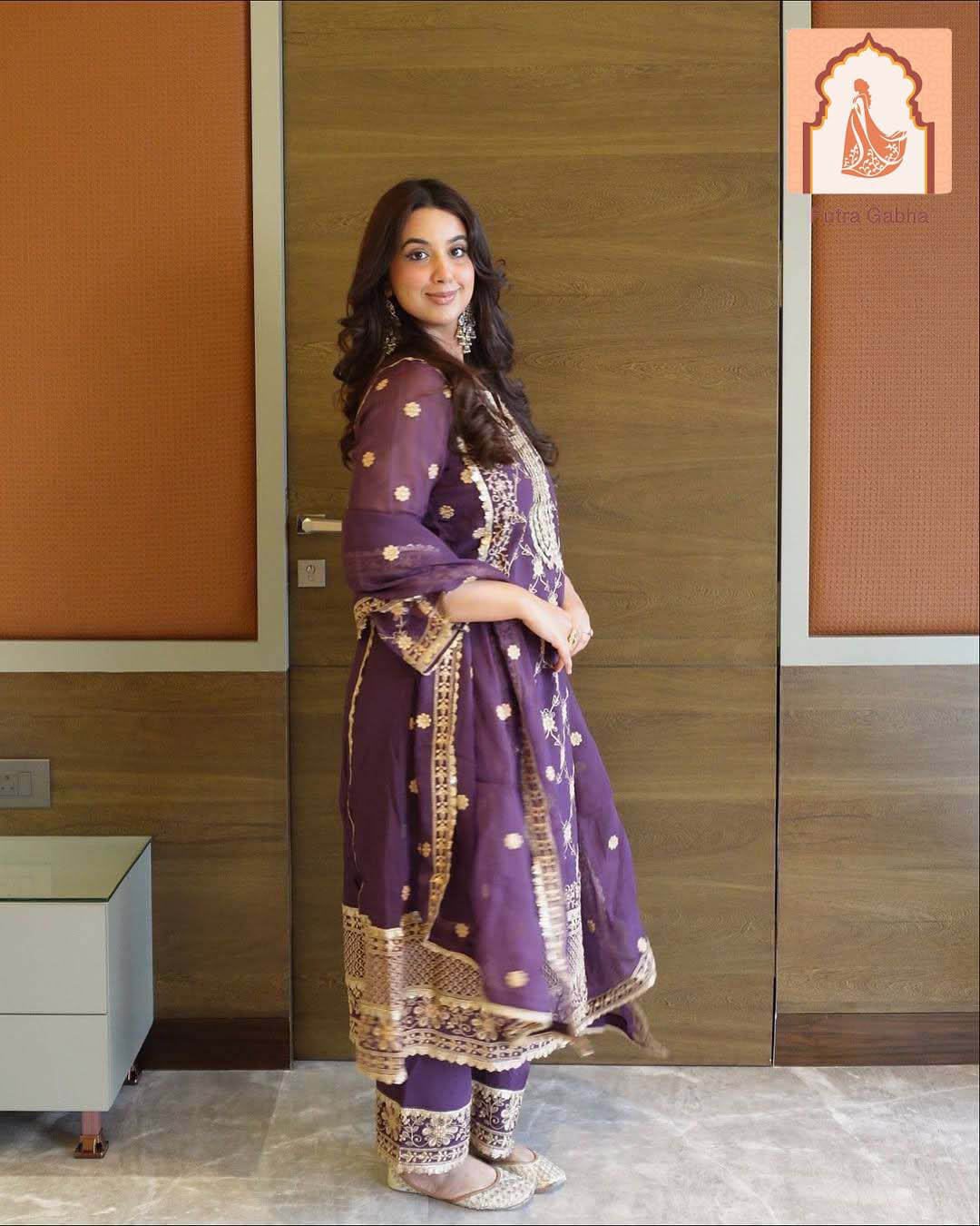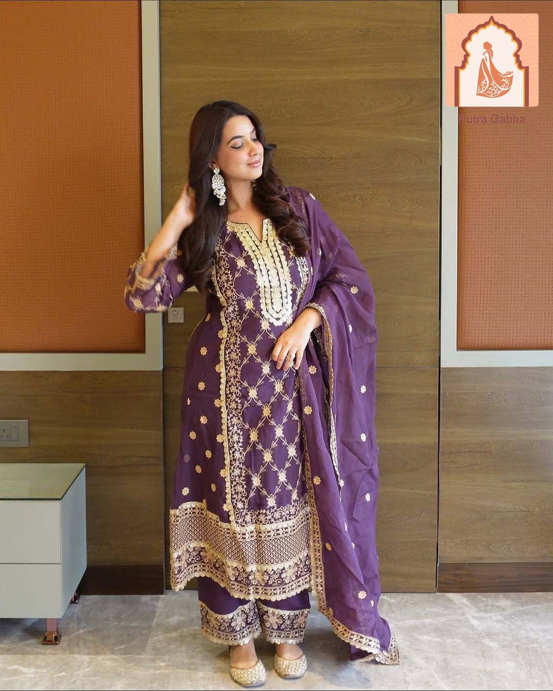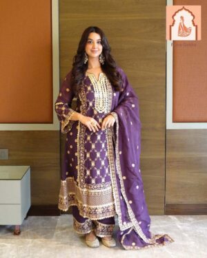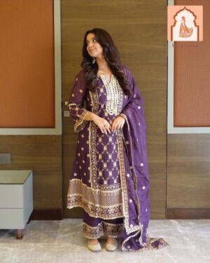 Elegant purple Chinnon suit with intricate embroidery & sequence work, perfect for weddings, festivals, or special occasions. The set includes a stylish top, matching pants, and a beautiful dupatta for a complete traditional look. Premium quality, ready to wear, and fully stitched for convenience.
