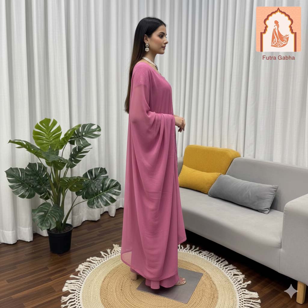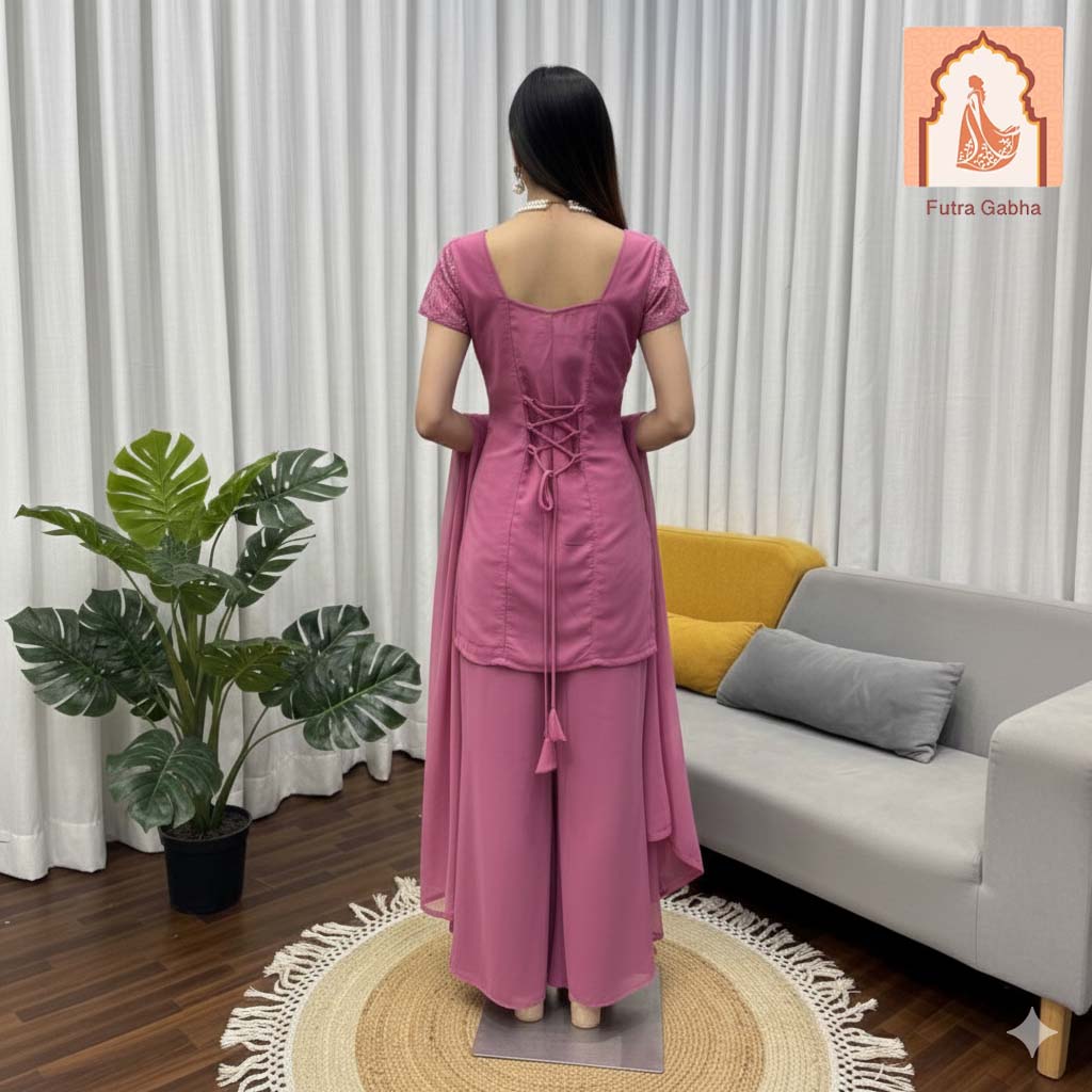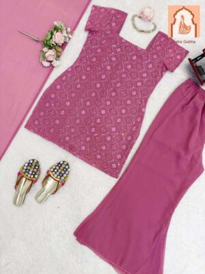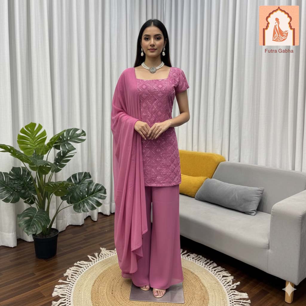 A beautiful, contemporary pink georgette kurta set featuring intricate geometric embroidery, paired with flowing palazzo pants and a matching dupatta, perfect for any special occasion.