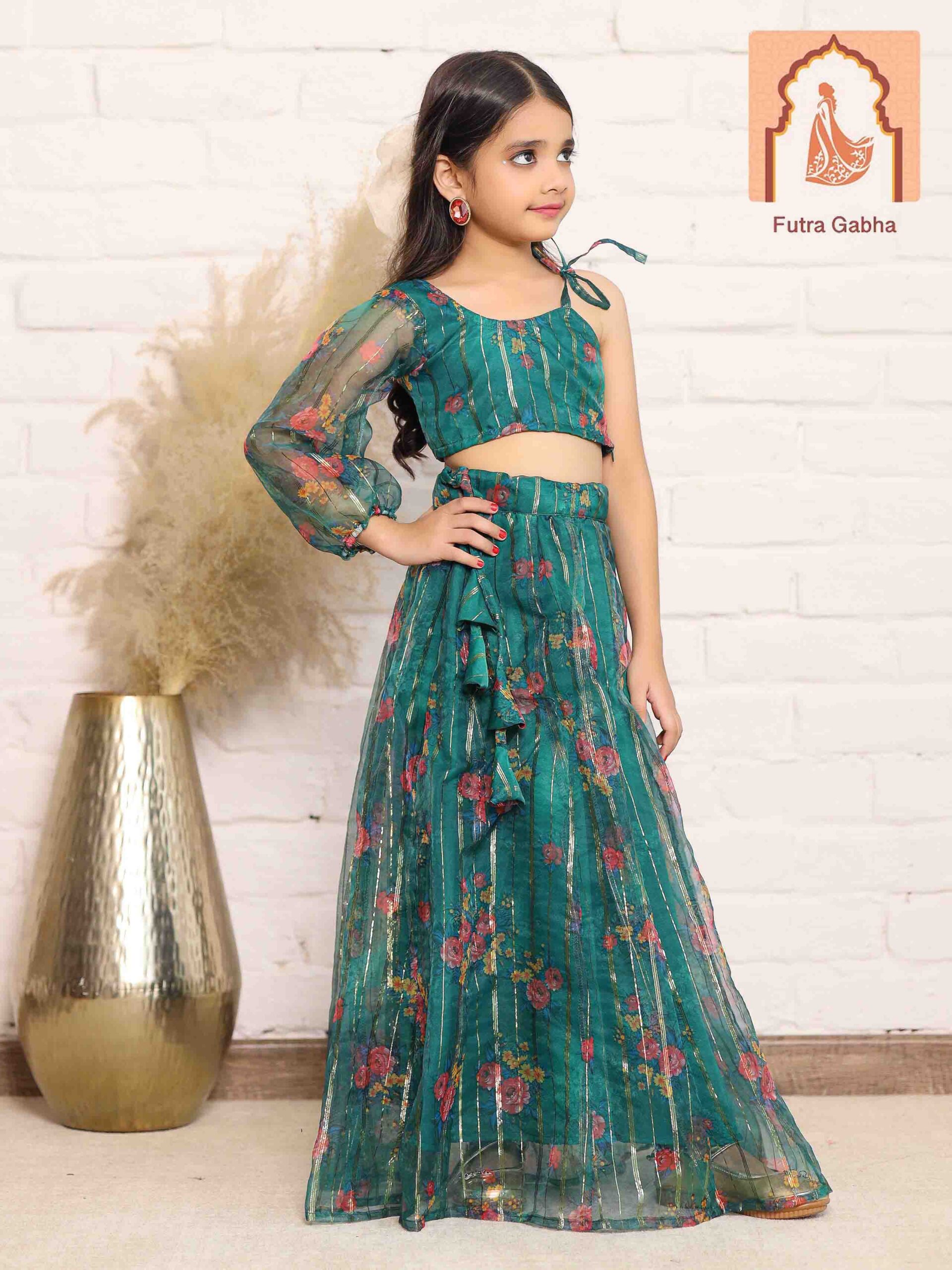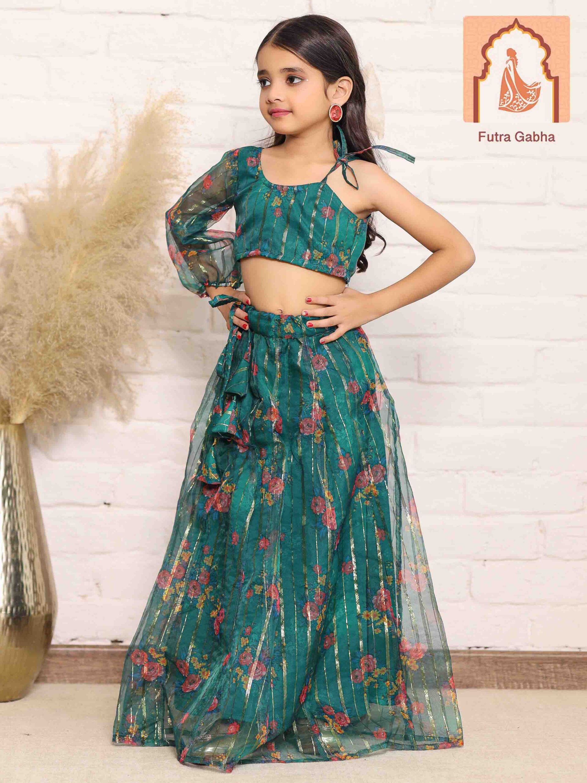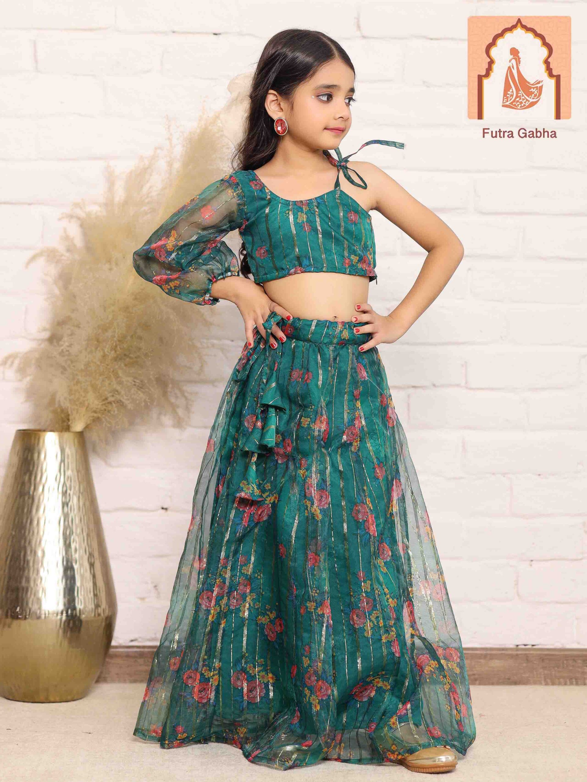 Tags: Digital print and zari print outfit for girls, Festive Wear For Girls, Floral print top and skirt set, Futra Gabha kids fashion, gentle wash kids clothing, Green organza one-shoulder top and skirt set for kids, Unique sleeve design kids outfit