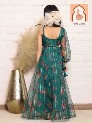This stylish outfit is the Elegant Green Organza One-Shoulder Digital Print Top & Skirt Set for girls by the brand Futra Gabha. The ensemble features a teal green color with a vibrant floral and gold sequin print.
