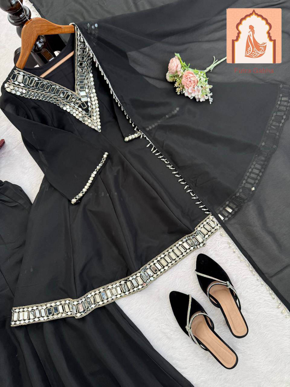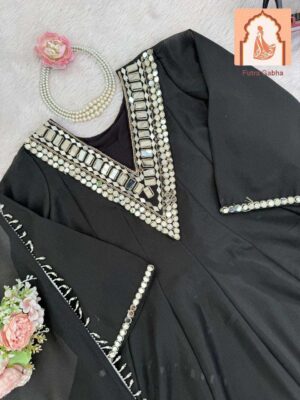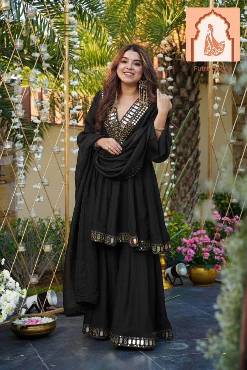 This is a stunning Black Gharara or Sharara set featuring a short, flared Anarkali-style kurta. The outfit is richly embellished with a statement mirror-work (Abla work) yoke and decorative mirrored borders on the kurta and the hem of the gharara, making it an excellent choice for a festive evening.