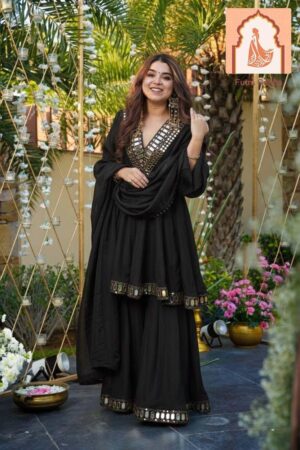 Upgrade your festive and wedding wardrobe with this Premium 3-Piece Palazzo Set crafted in Cosmos fabric. The outfit is designed in a stunning Balck shade, giving it a royal and elegant appeal. The top features real mirror work with intricate embroidery, creating a rich designer look perfect for functions, parties, and special occasions.