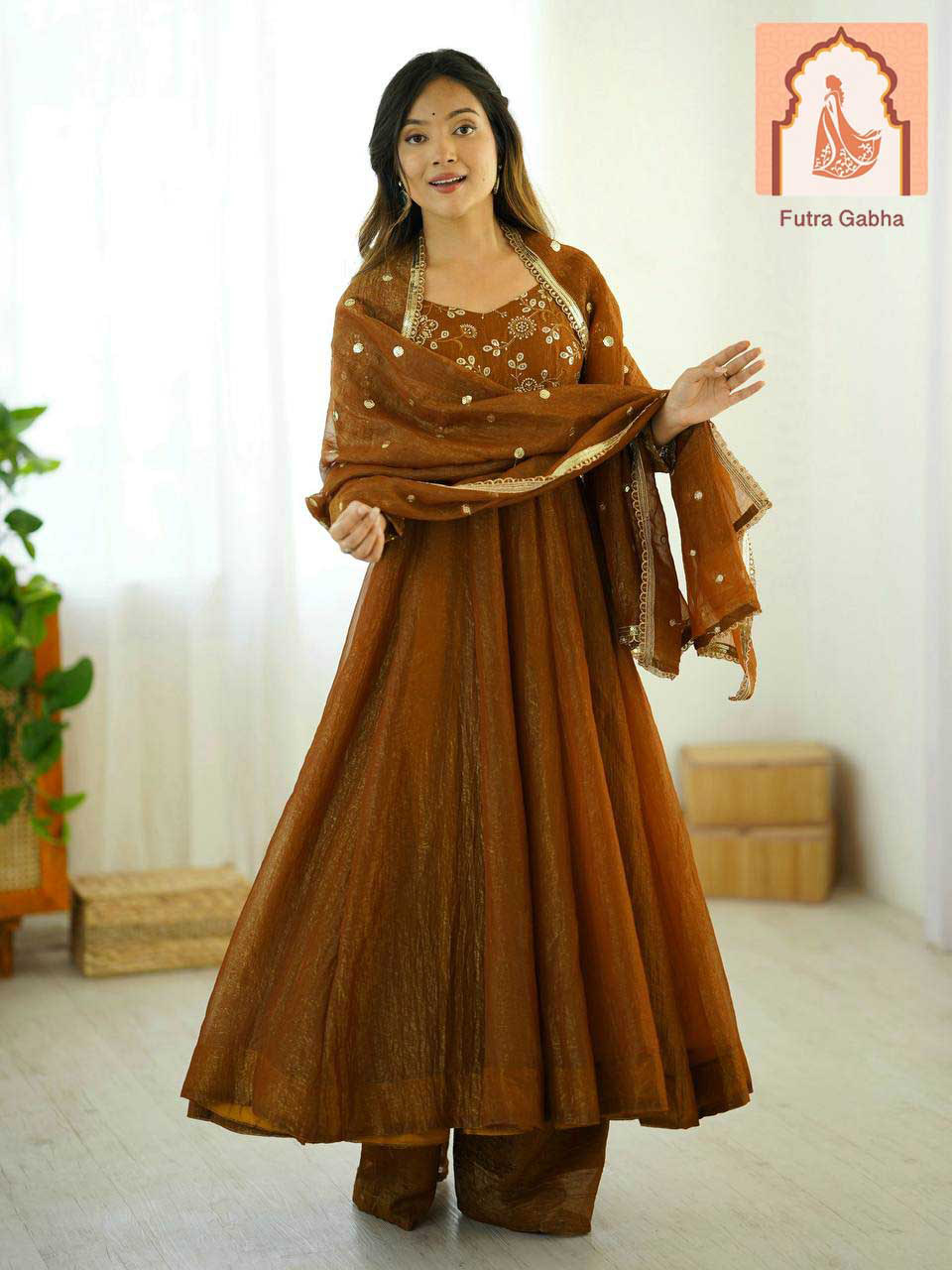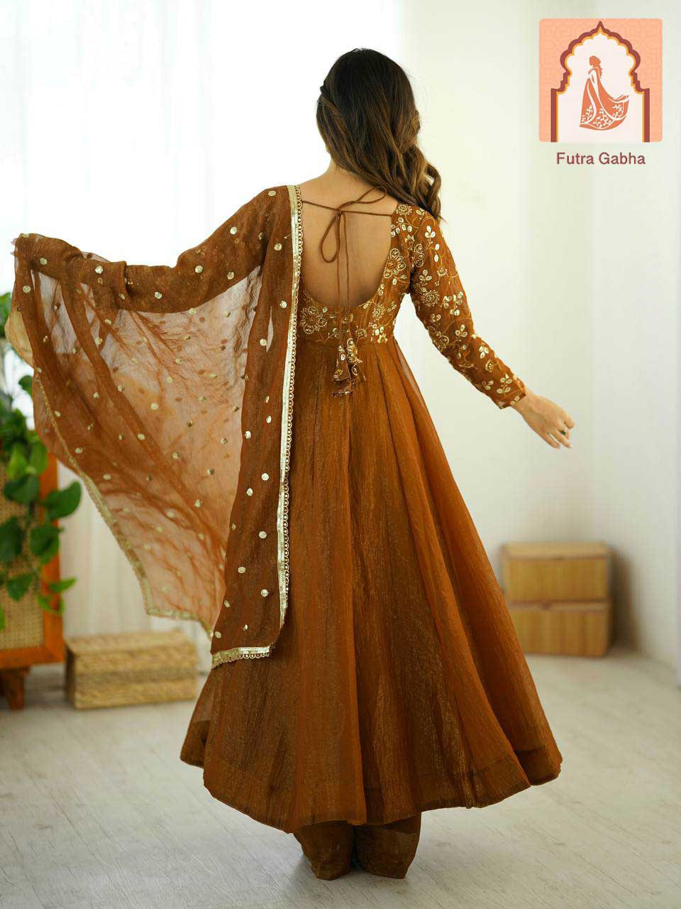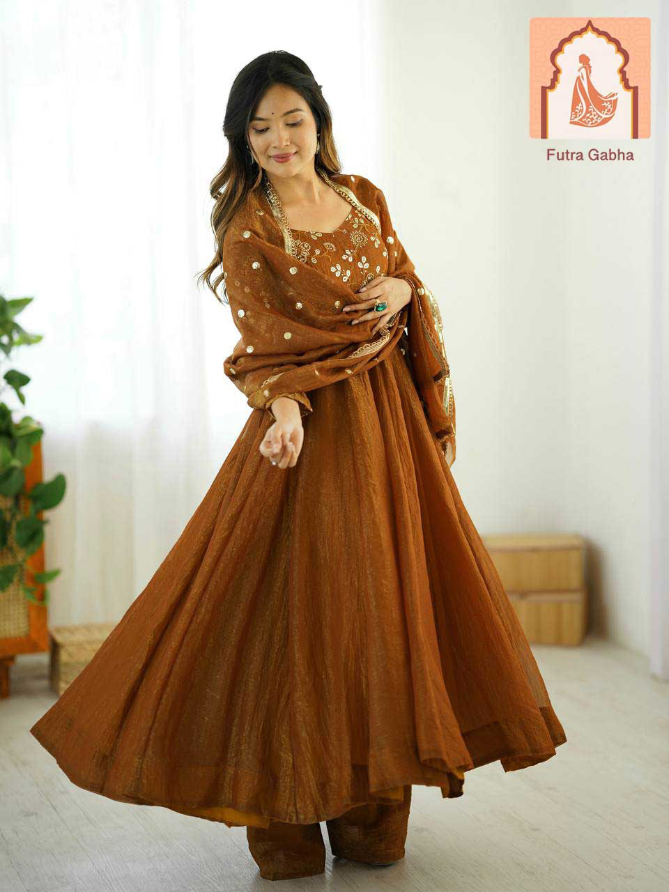 This image features a Mustard Anarkali gown suit set with gold embroidery and a lace border. The long, flowing gown has full sleeves and a fitted, embroidered bodice with a square neckline.