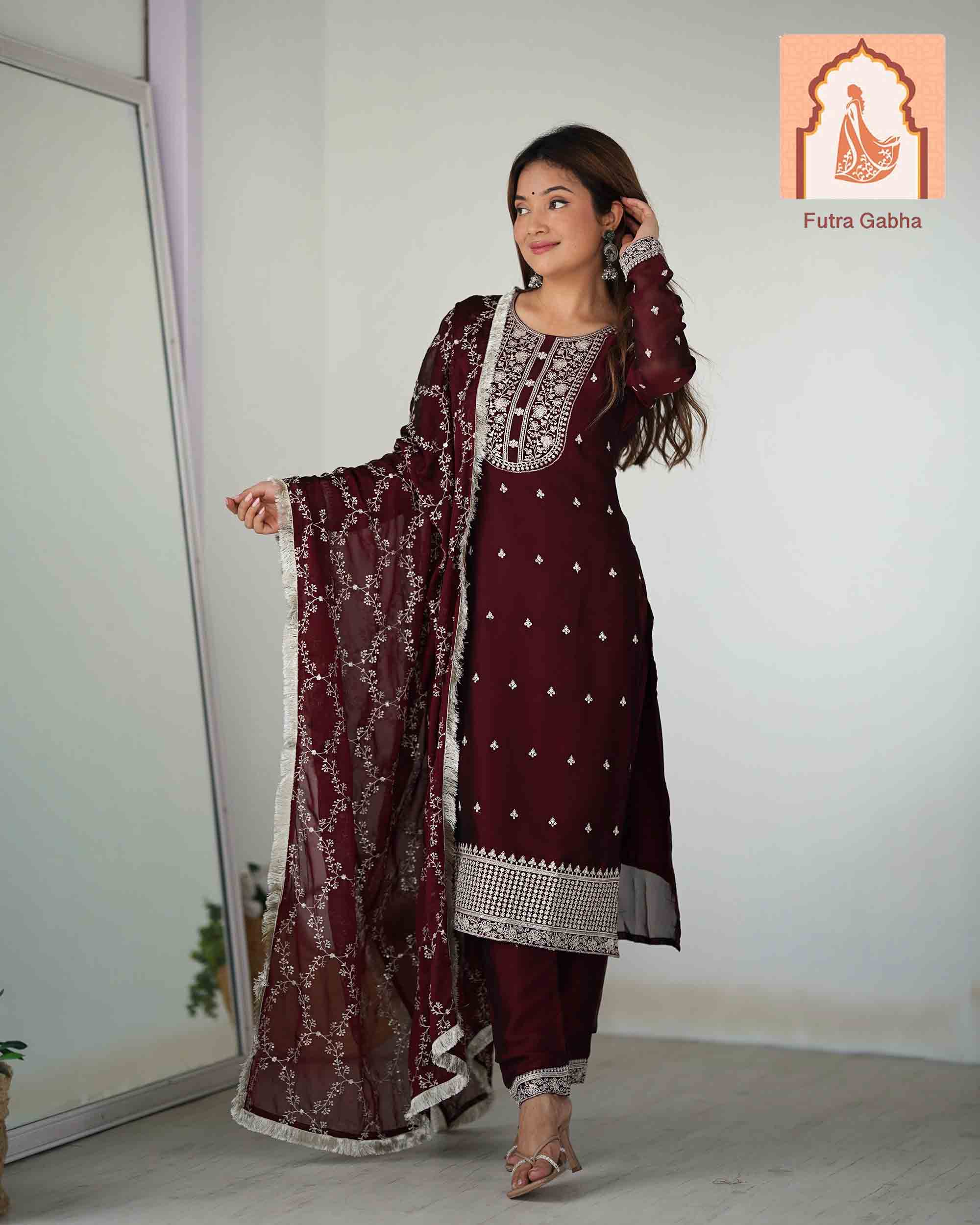 – Kurta Fabric: 👗 Pure Blooming Rangoli Silk with beautiful embroidery sequence & thread work on yoke, sleeves, bottom lace work, round neckline.