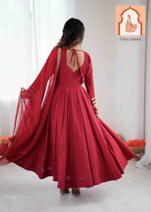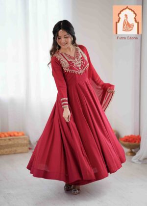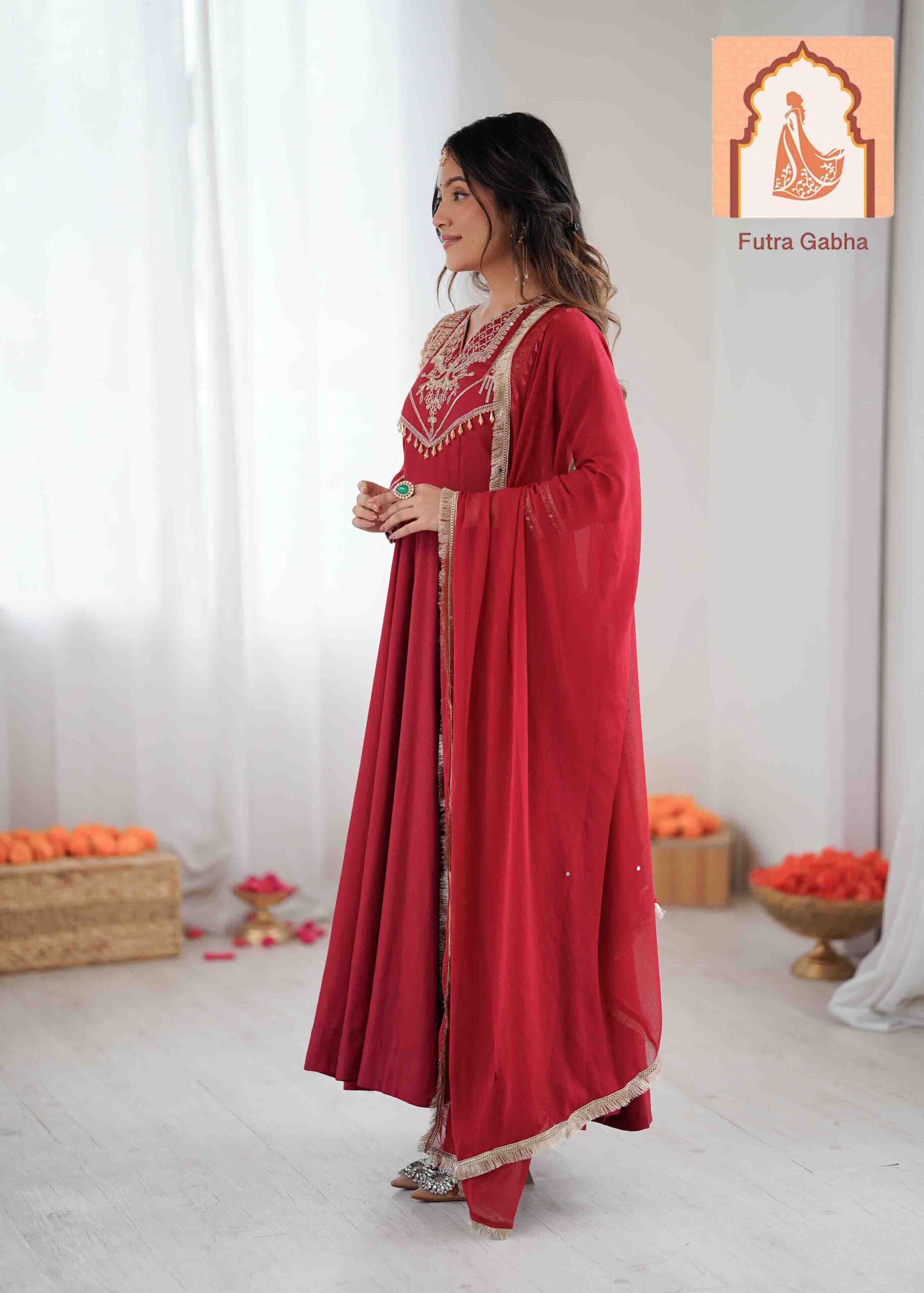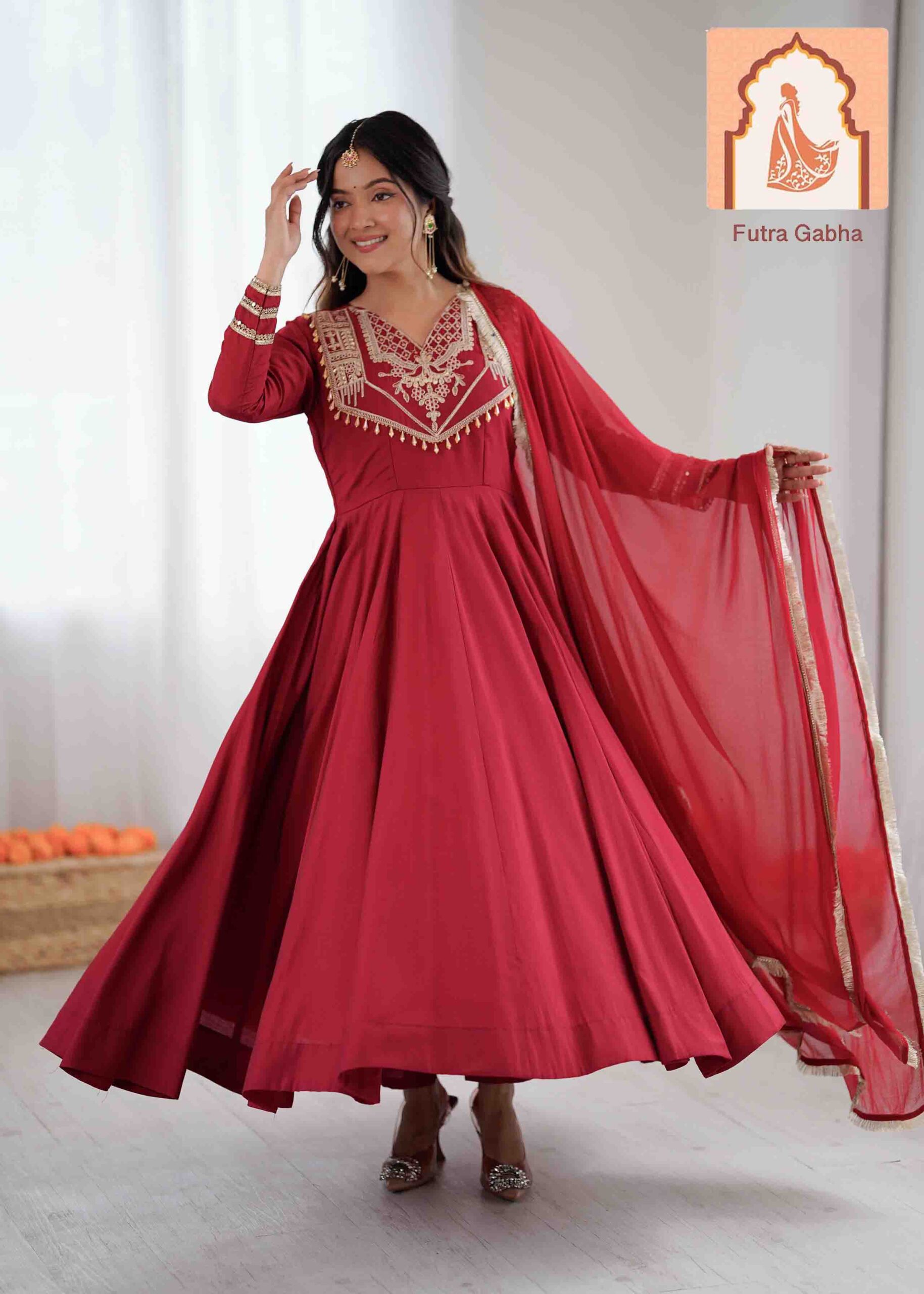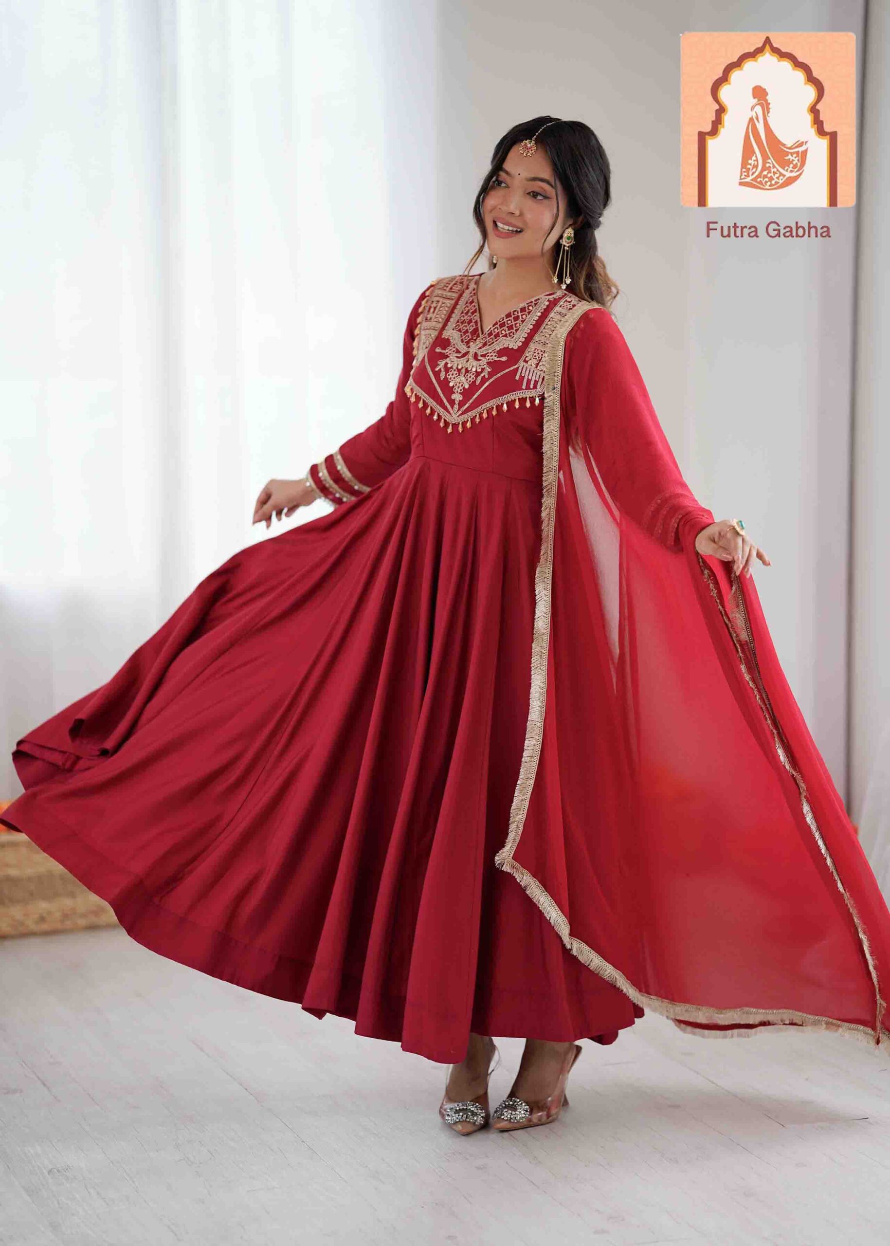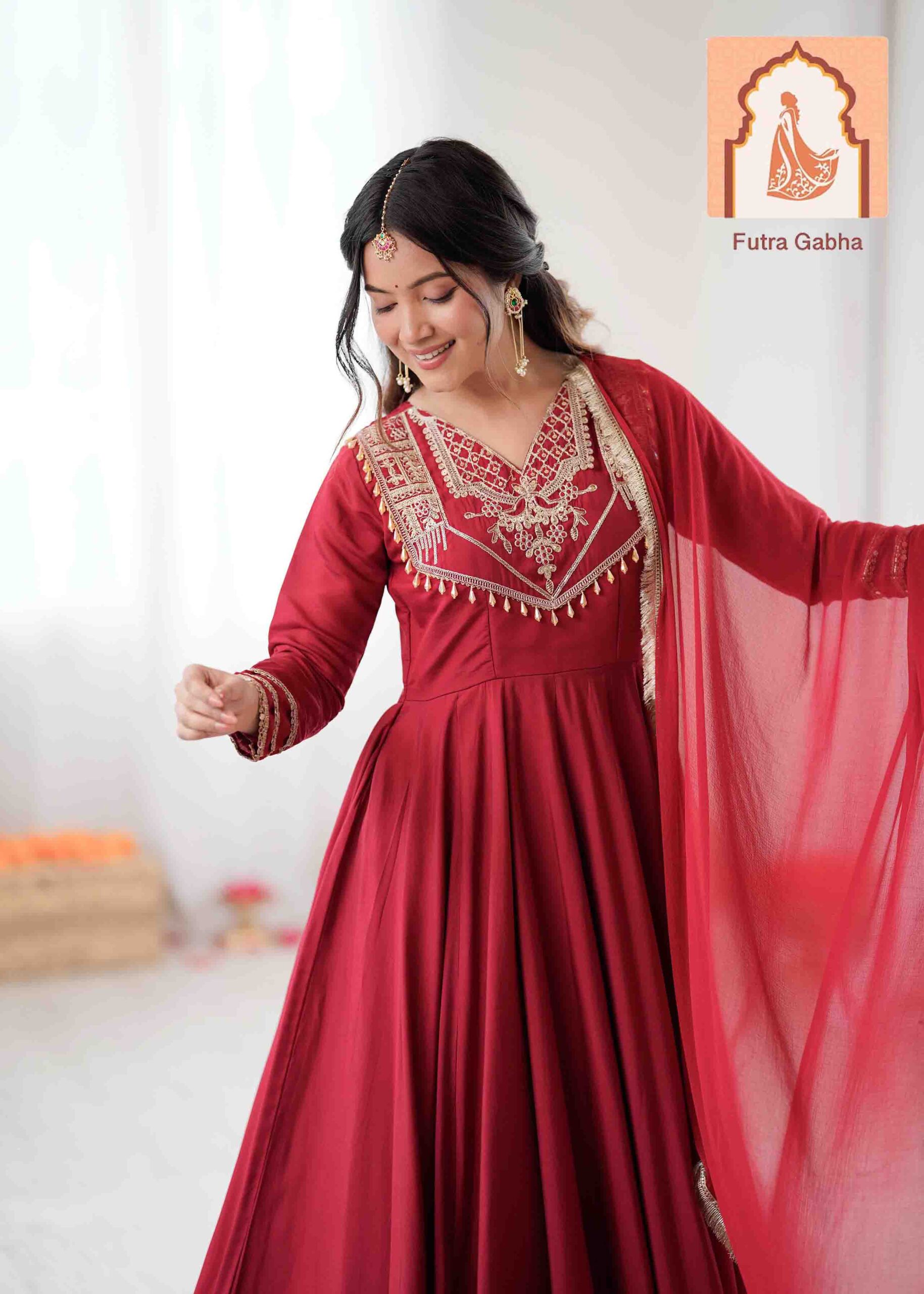A red Anarkali gown with gold embroidery, often sold as a three-piece set including a gown, bottom (churidar), and a dupatta. The brand name is Futra Gabha.