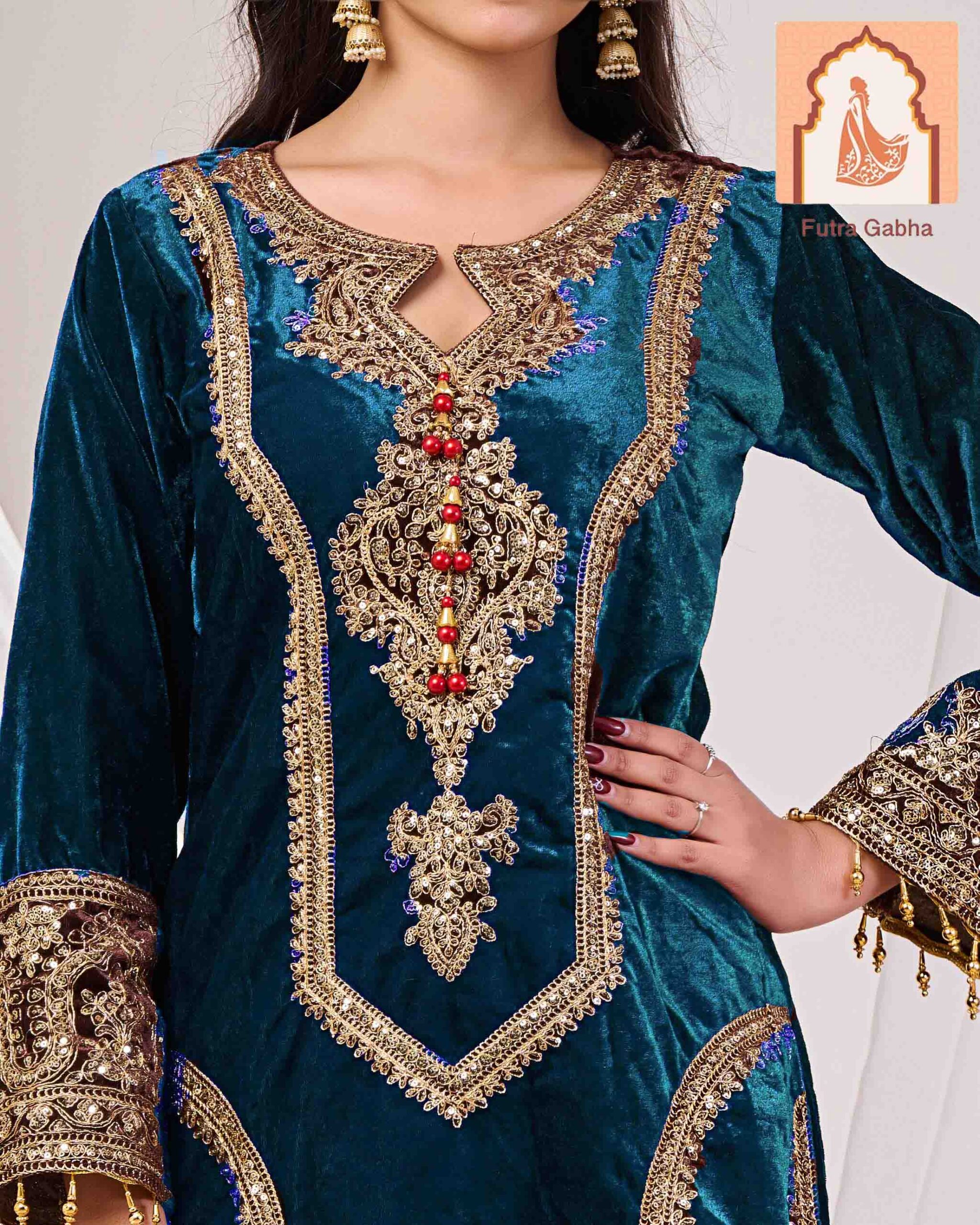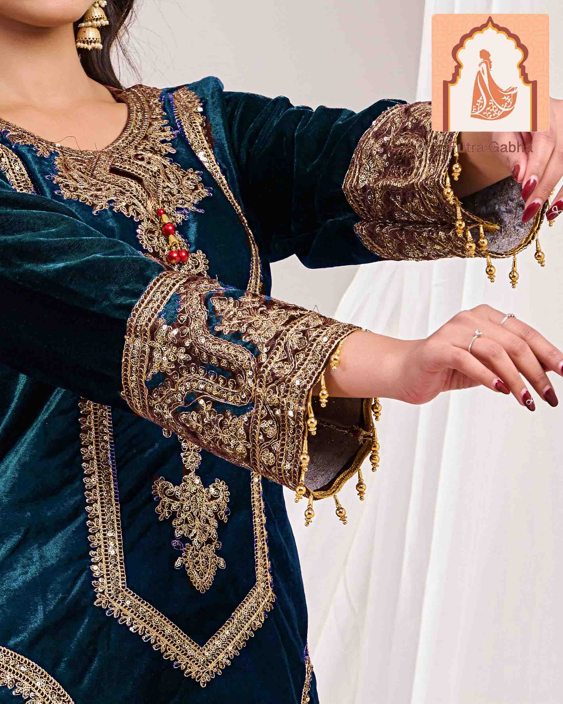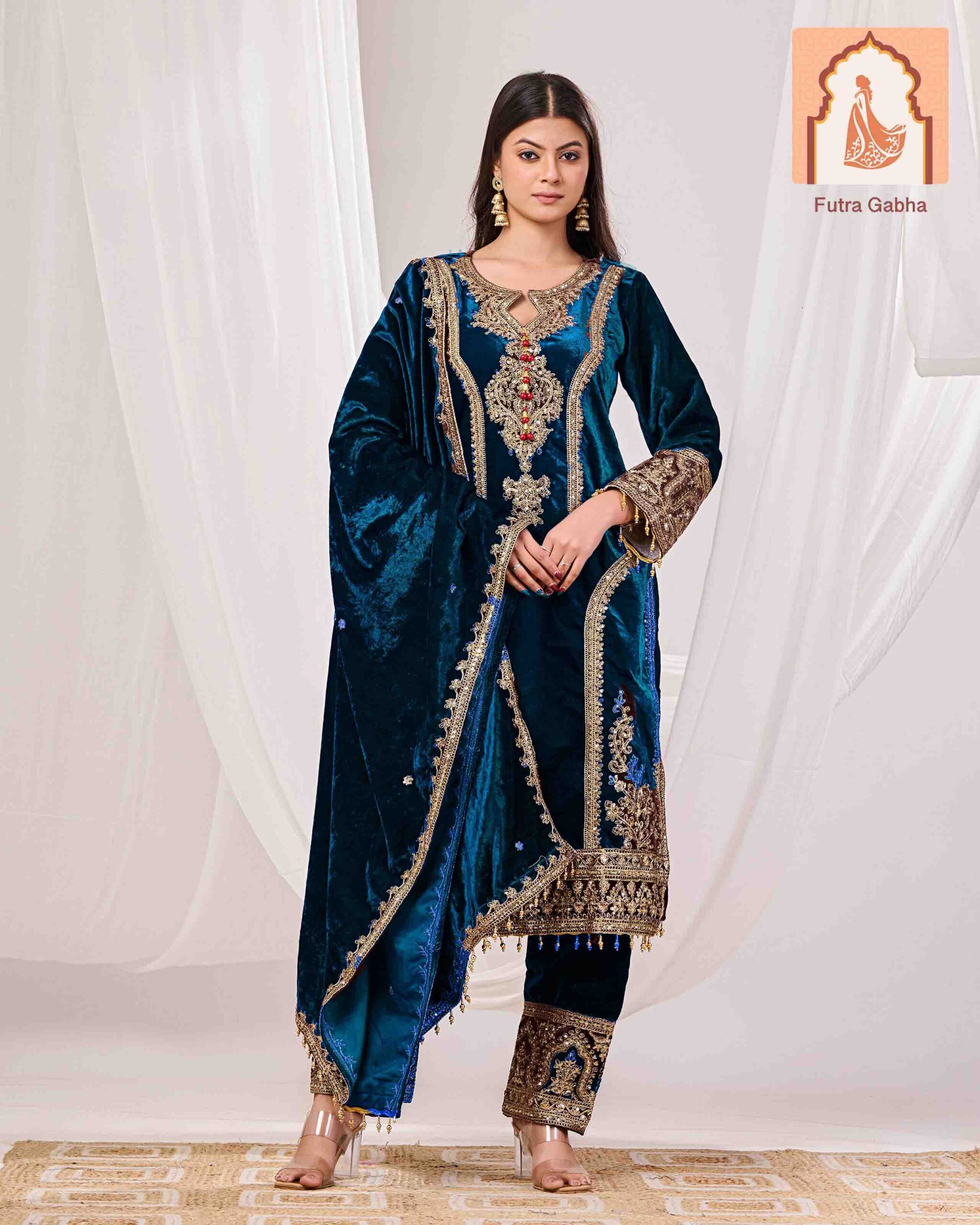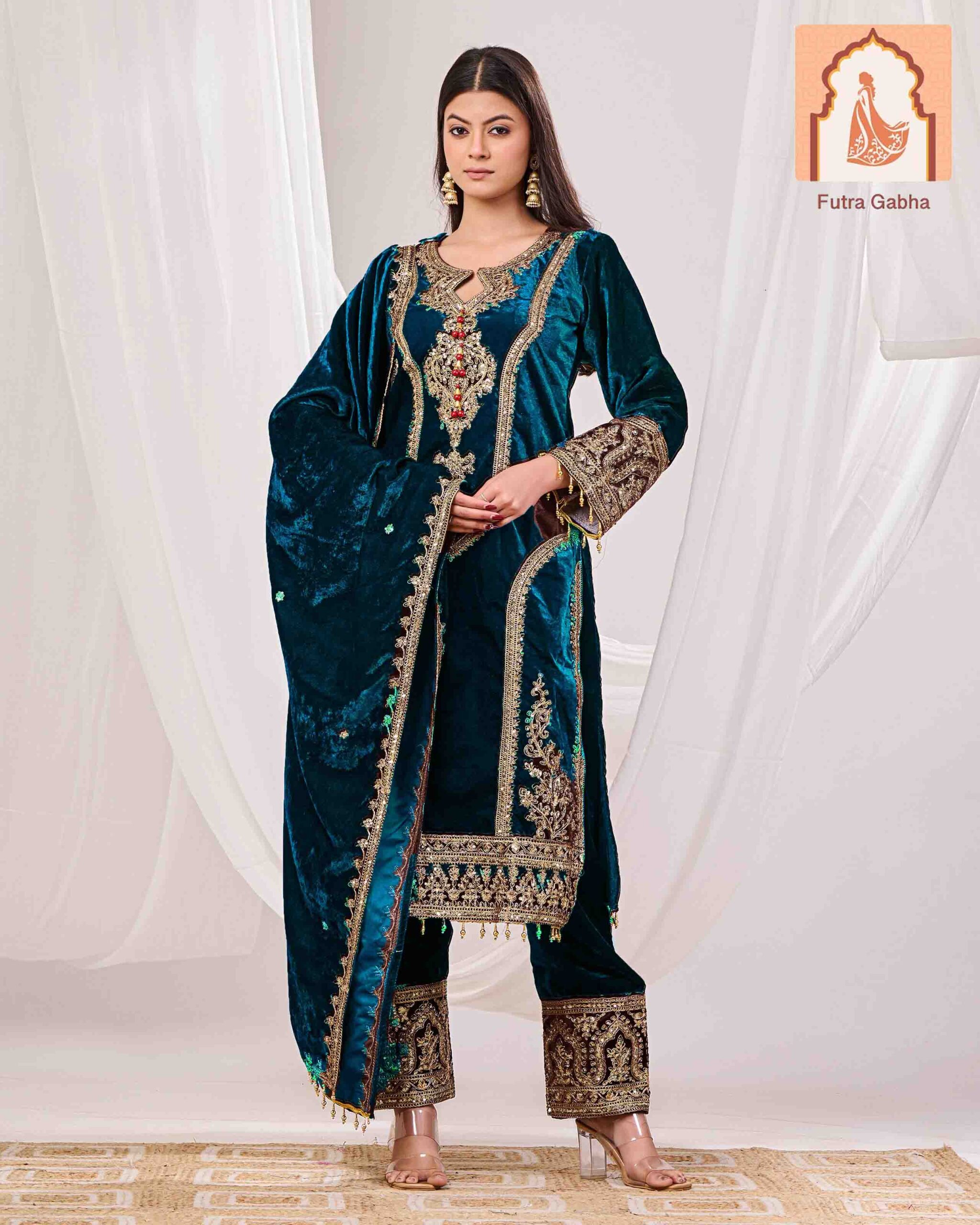 This is a stunning three-piece Teal Velvet Salwar Kameez set that exudes regal elegance, perfect for weddings, formal galas, or festive celebrations.