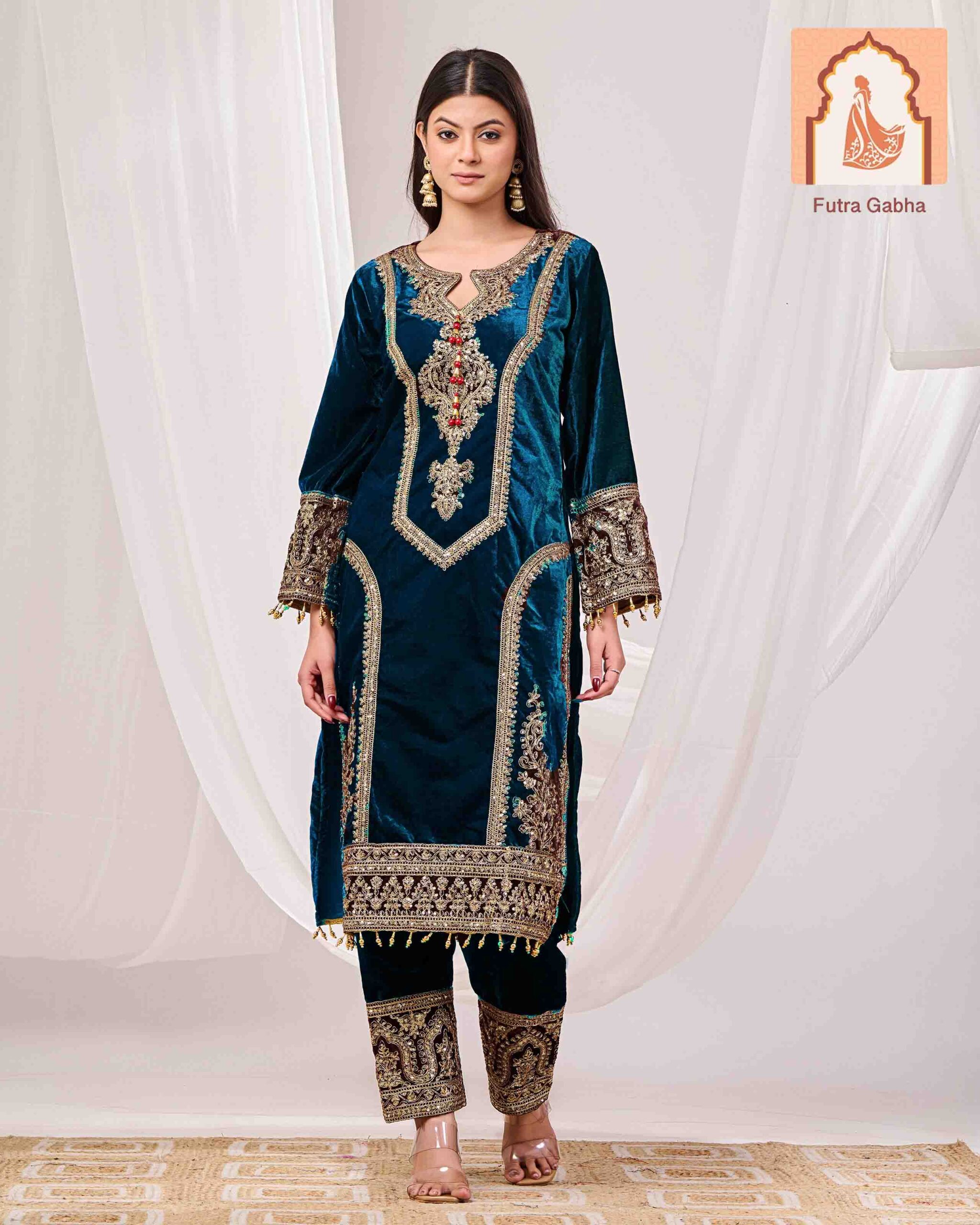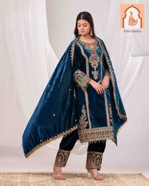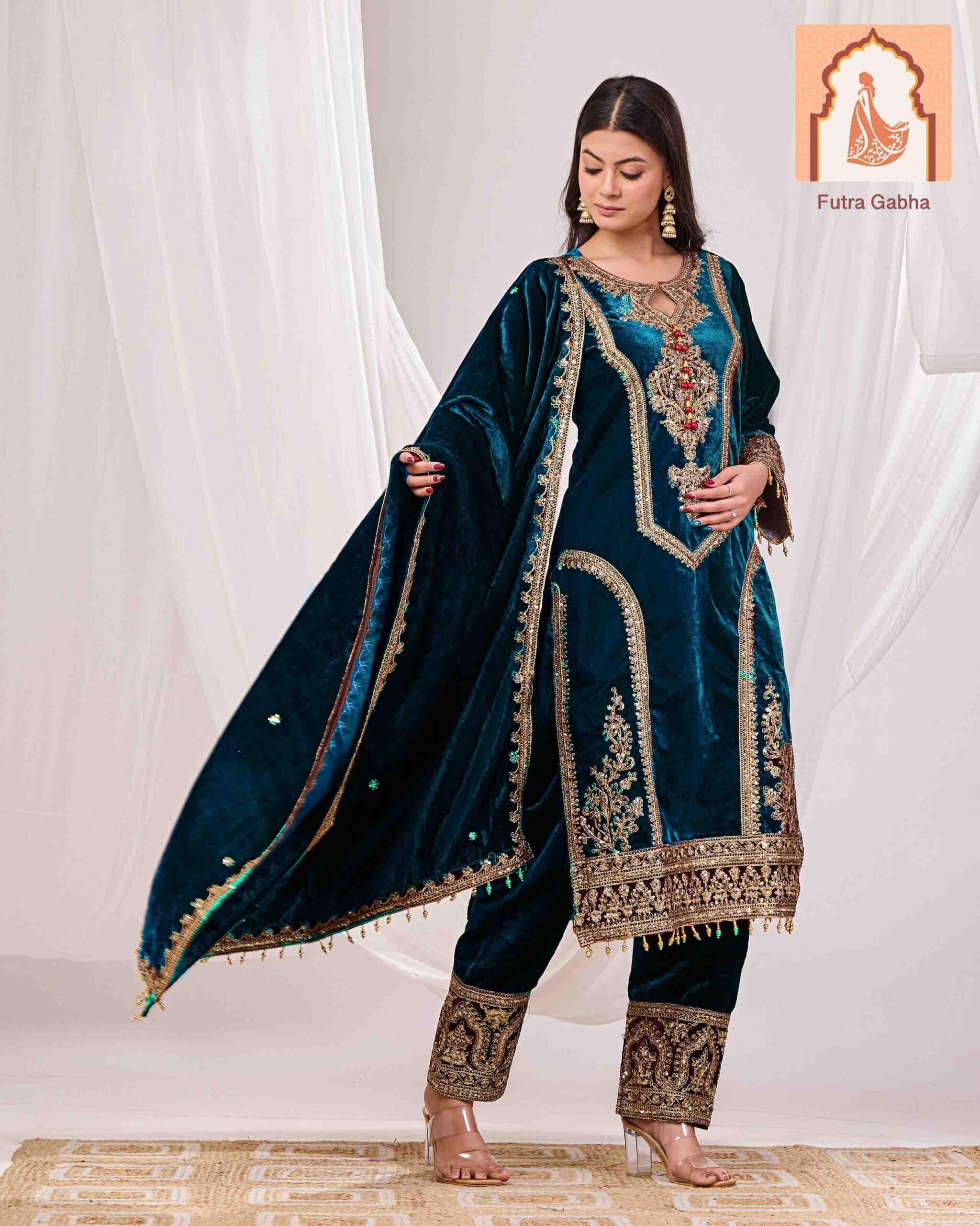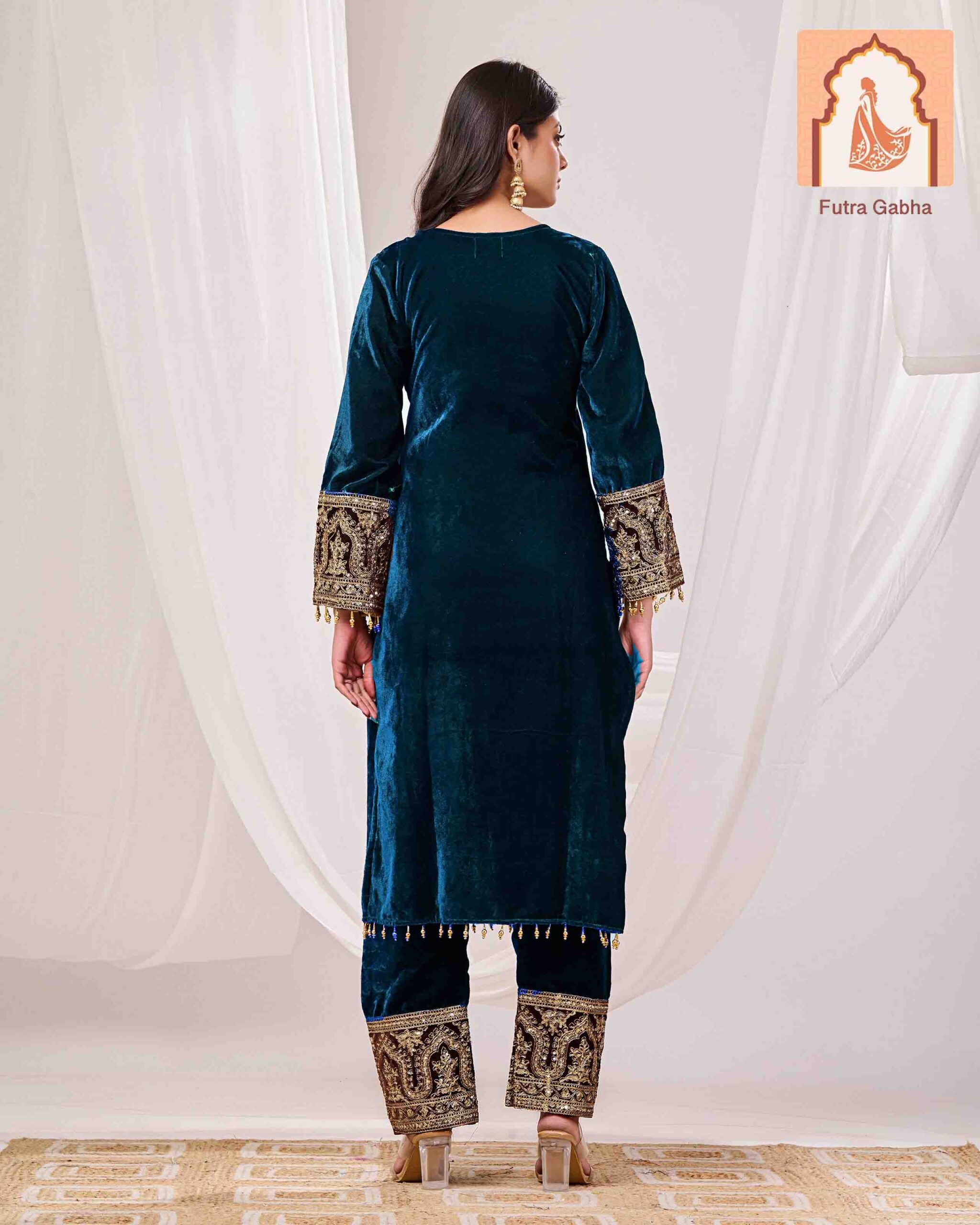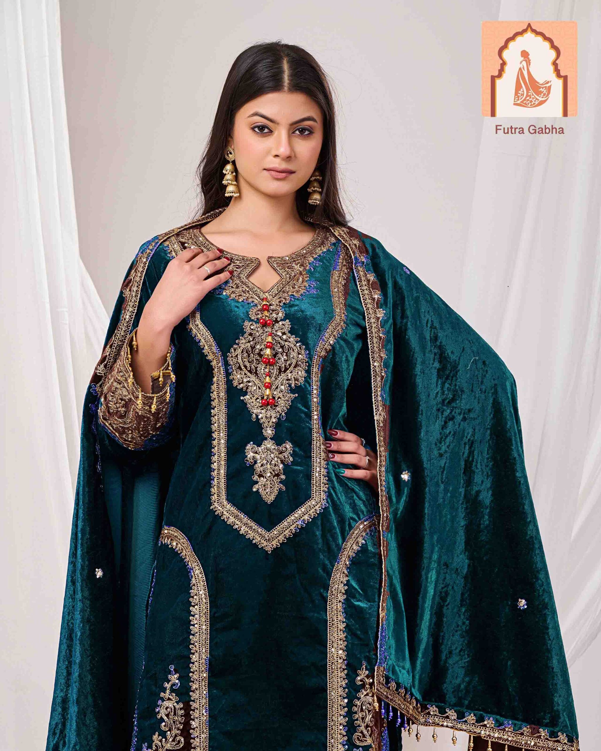 This is a stunning three-piece Teal Velvet Salwar Kameez set that exudes regal elegance, perfect for weddings, formal galas, or festive celebrations.