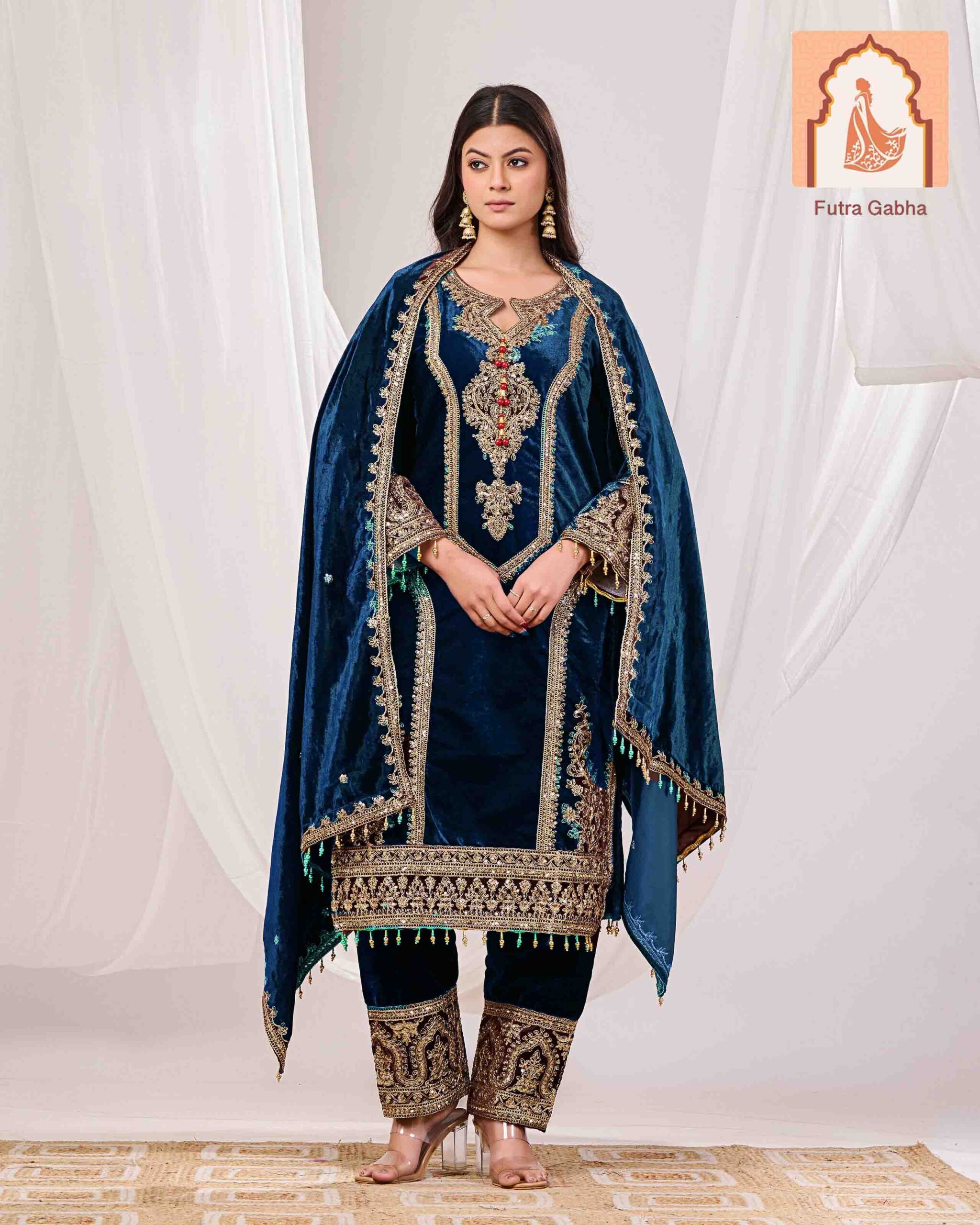 Blue Sequence work Velvet Suit Set with Velvet Dupatta ₹3,599