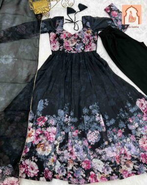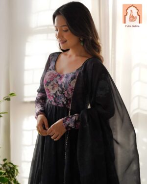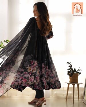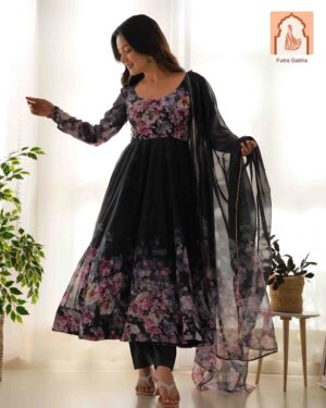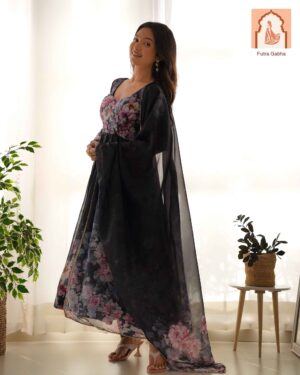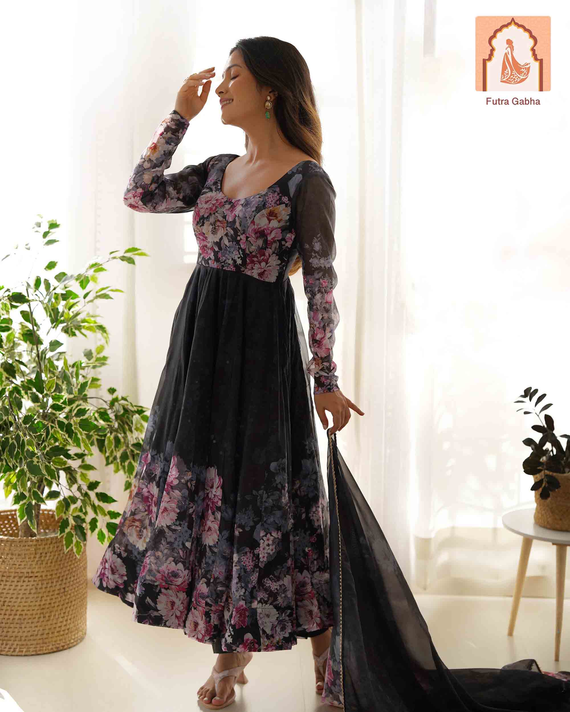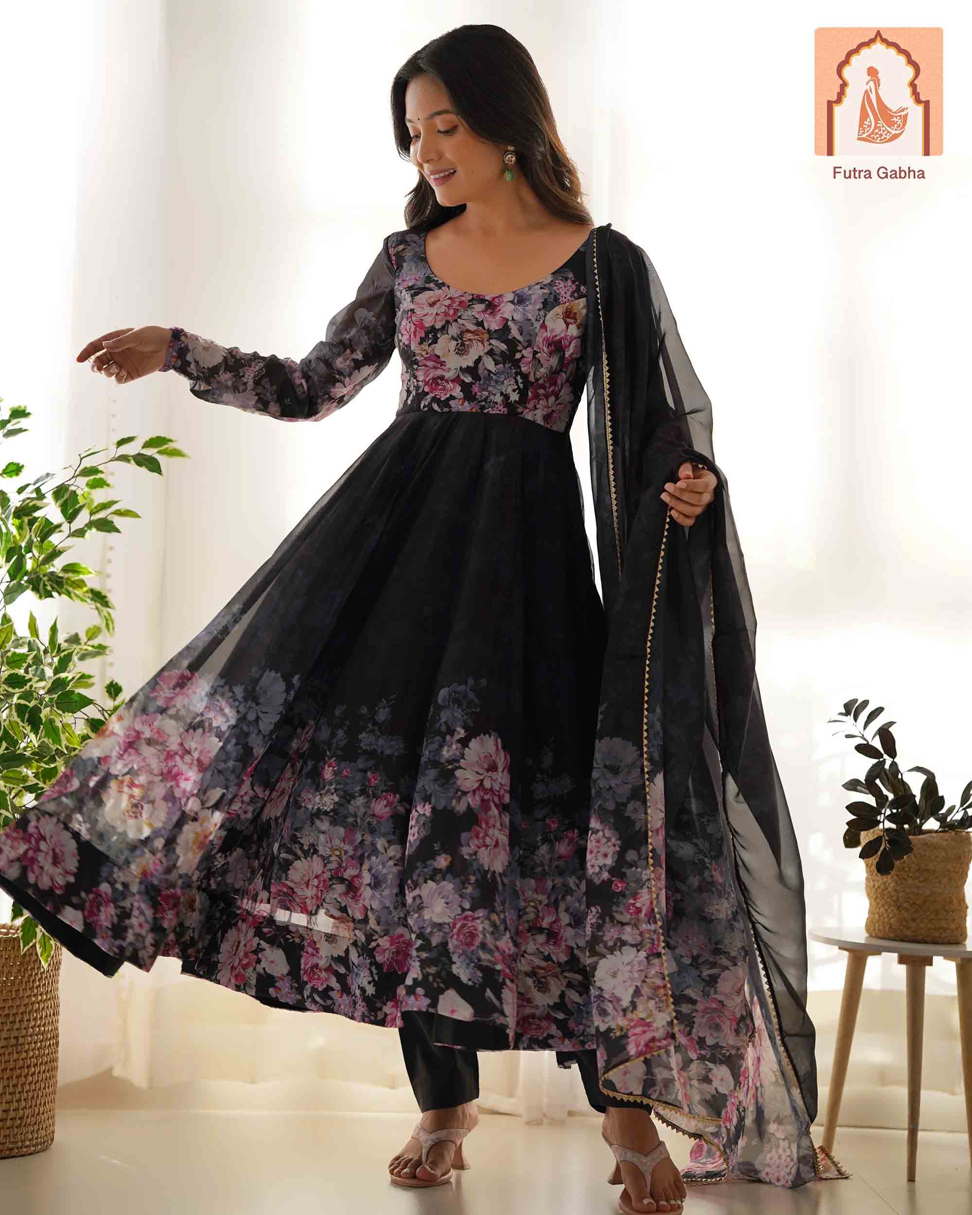 Perfect for festivals & weddings! This lightweight, breathable outfit features a beautiful floral print on pure soft organza silk with a 4m flair & canvas patta. Includes matching dupatta with gota patti lace & ready-to-wear pants.