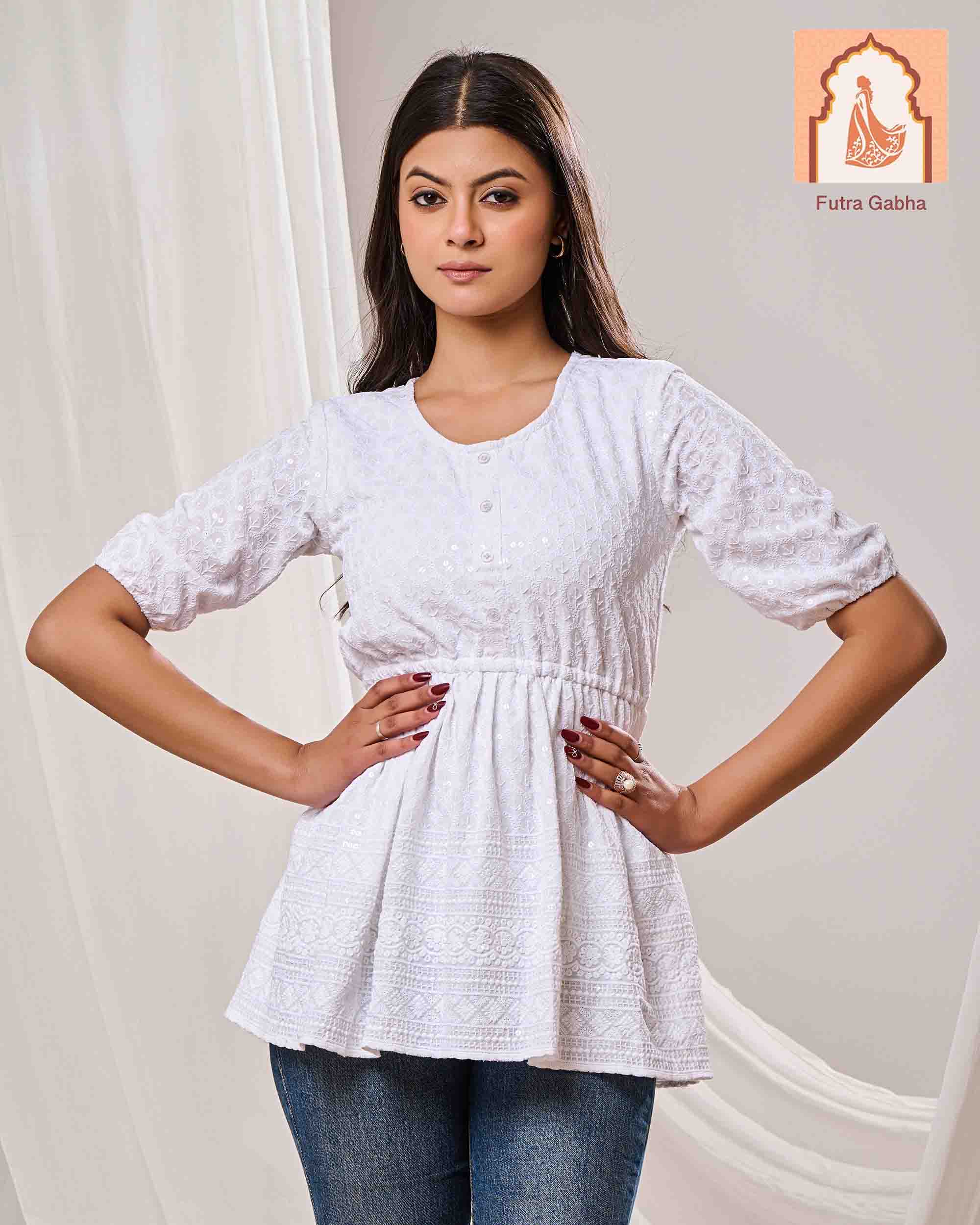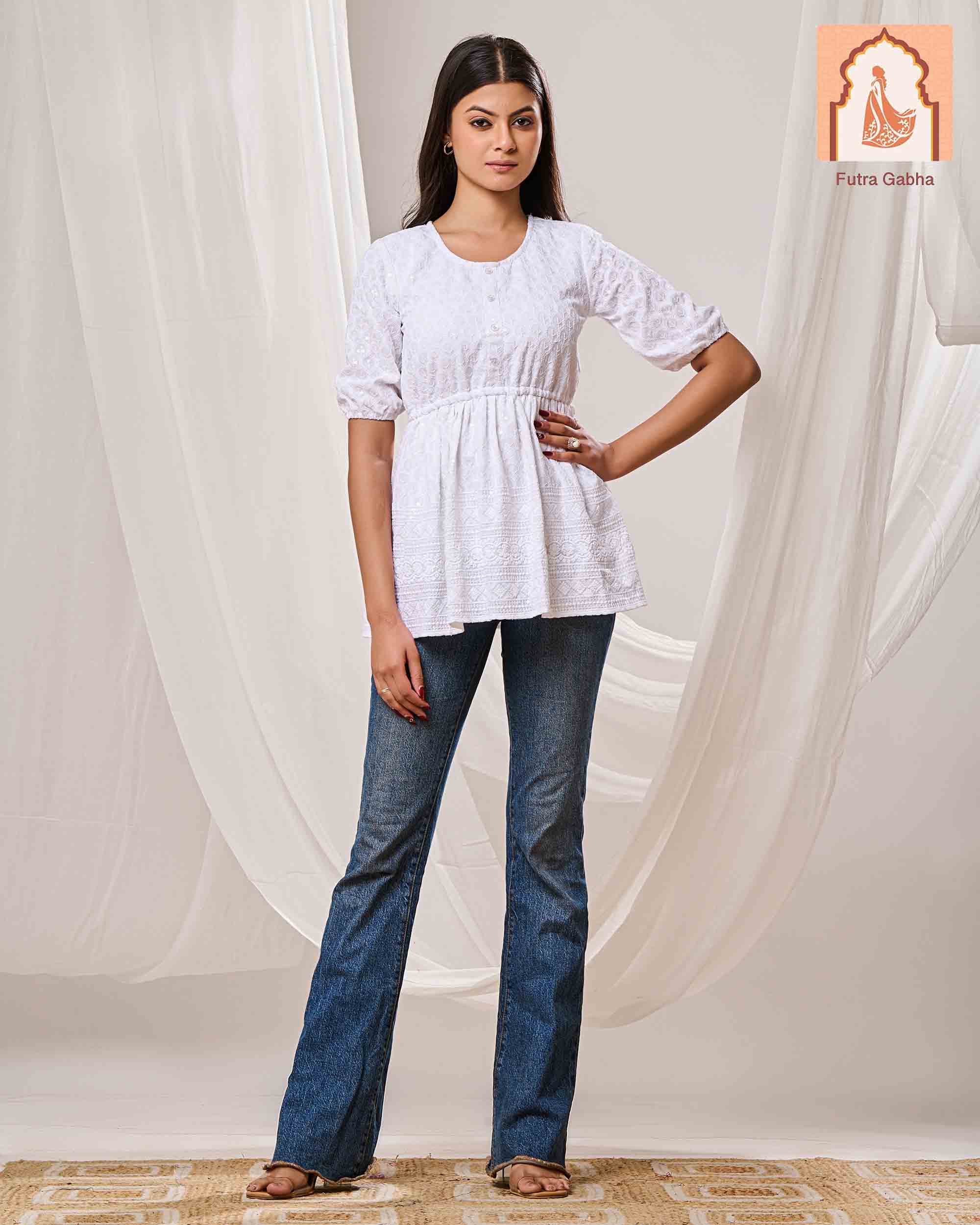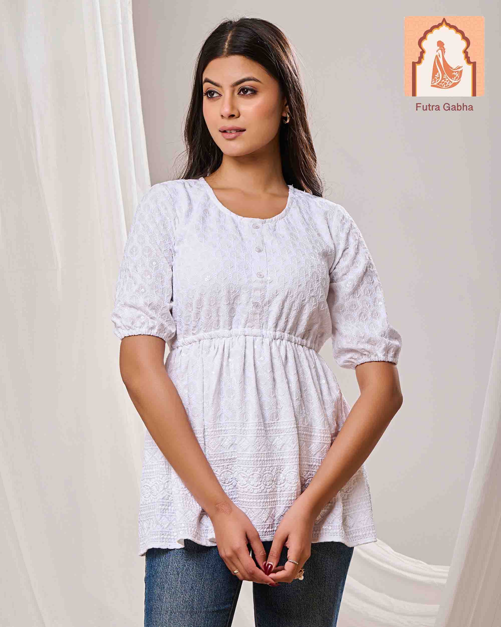 The top is a casual ethnic style, made from cotton fabric, and features a round neck, three-quarter regular sleeves, and delicate embroidery patterns throughout.