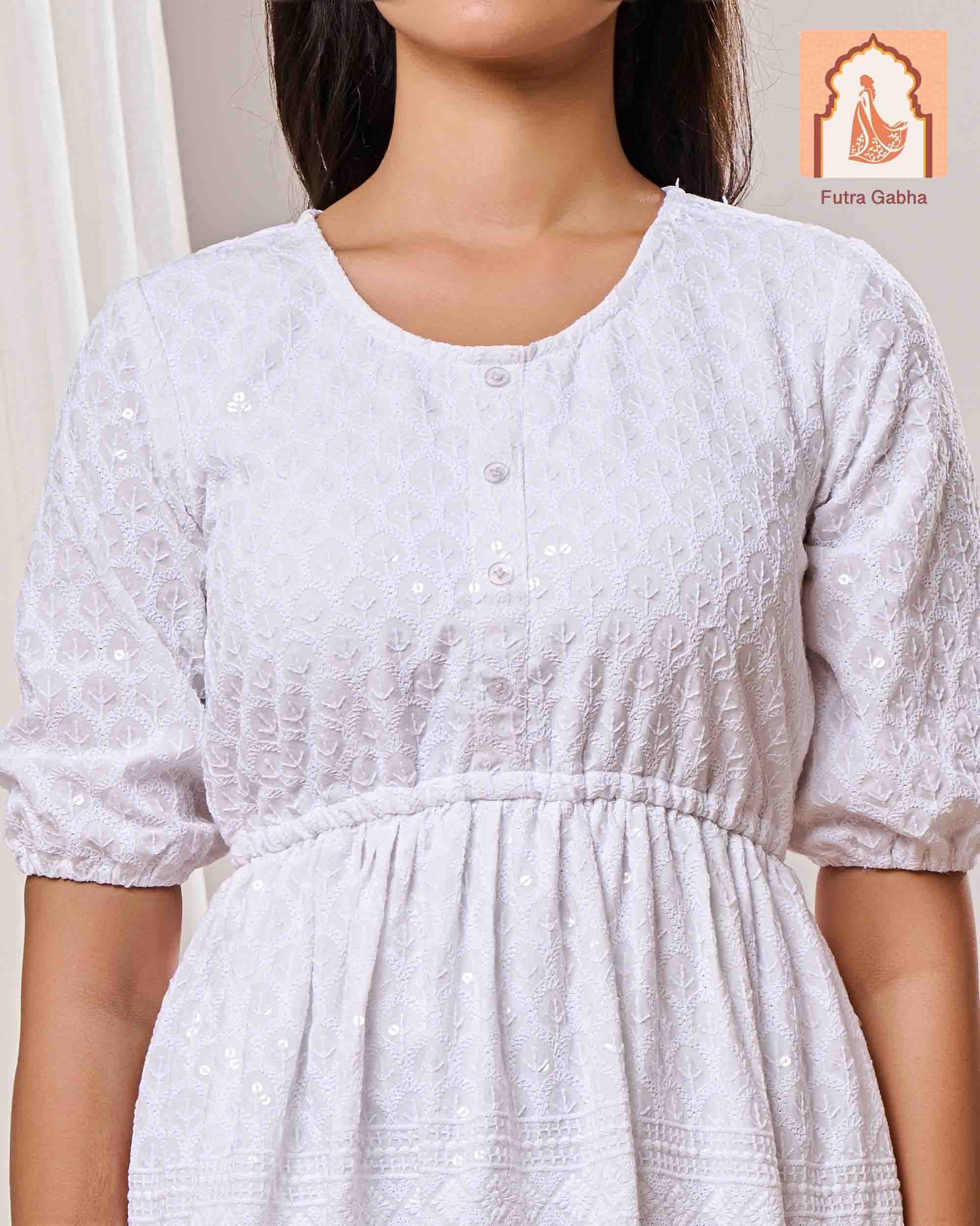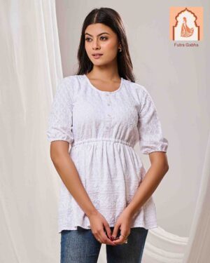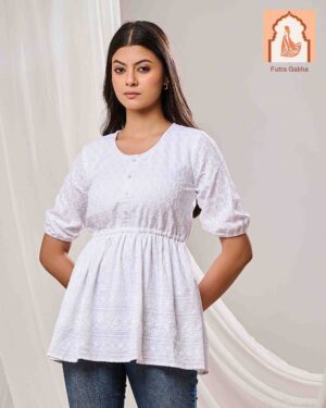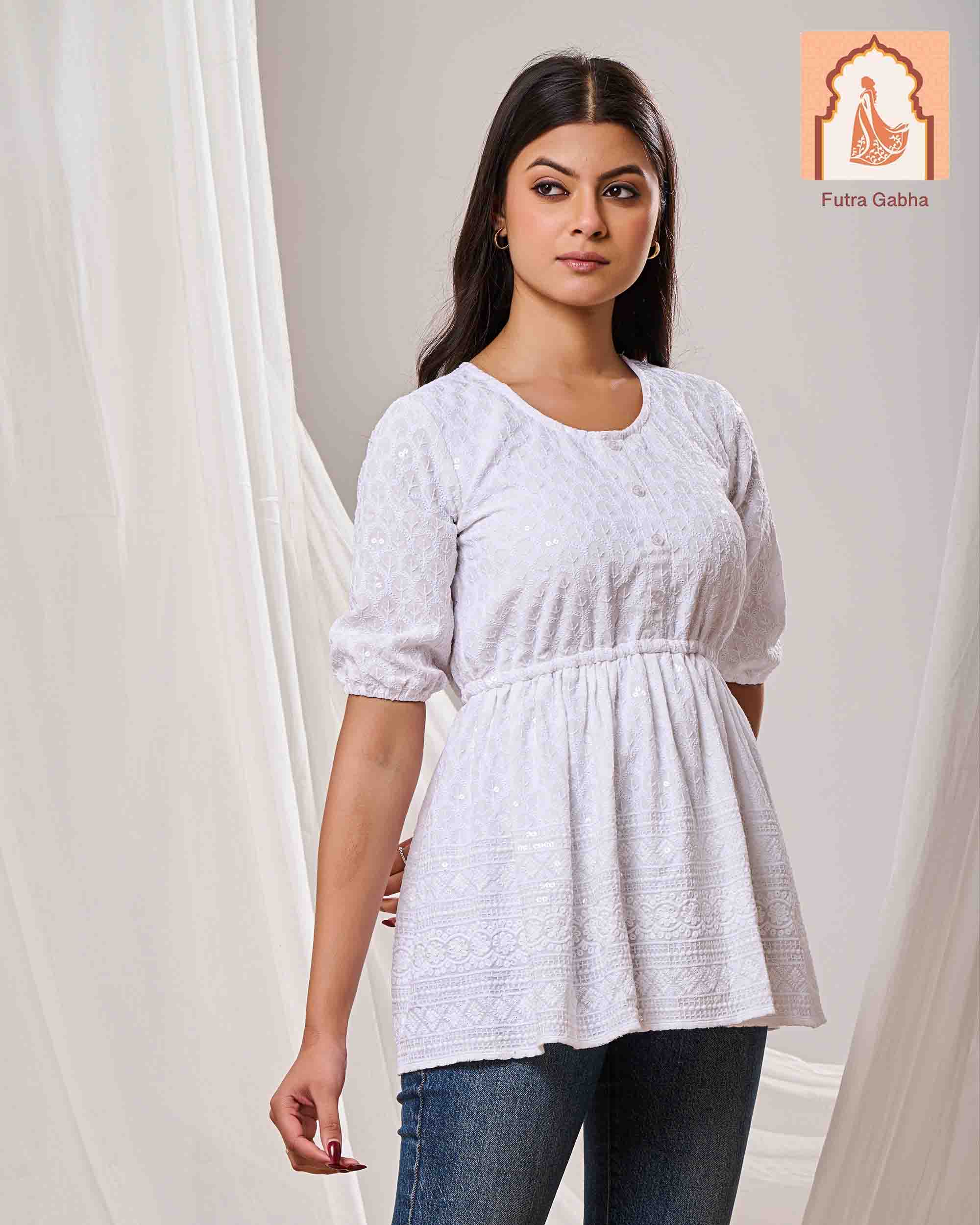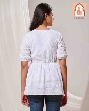 The top is a casual ethnic style, made from cotton fabric, and features a round neck, three-quarter regular sleeves, and delicate embroidery patterns throughout.