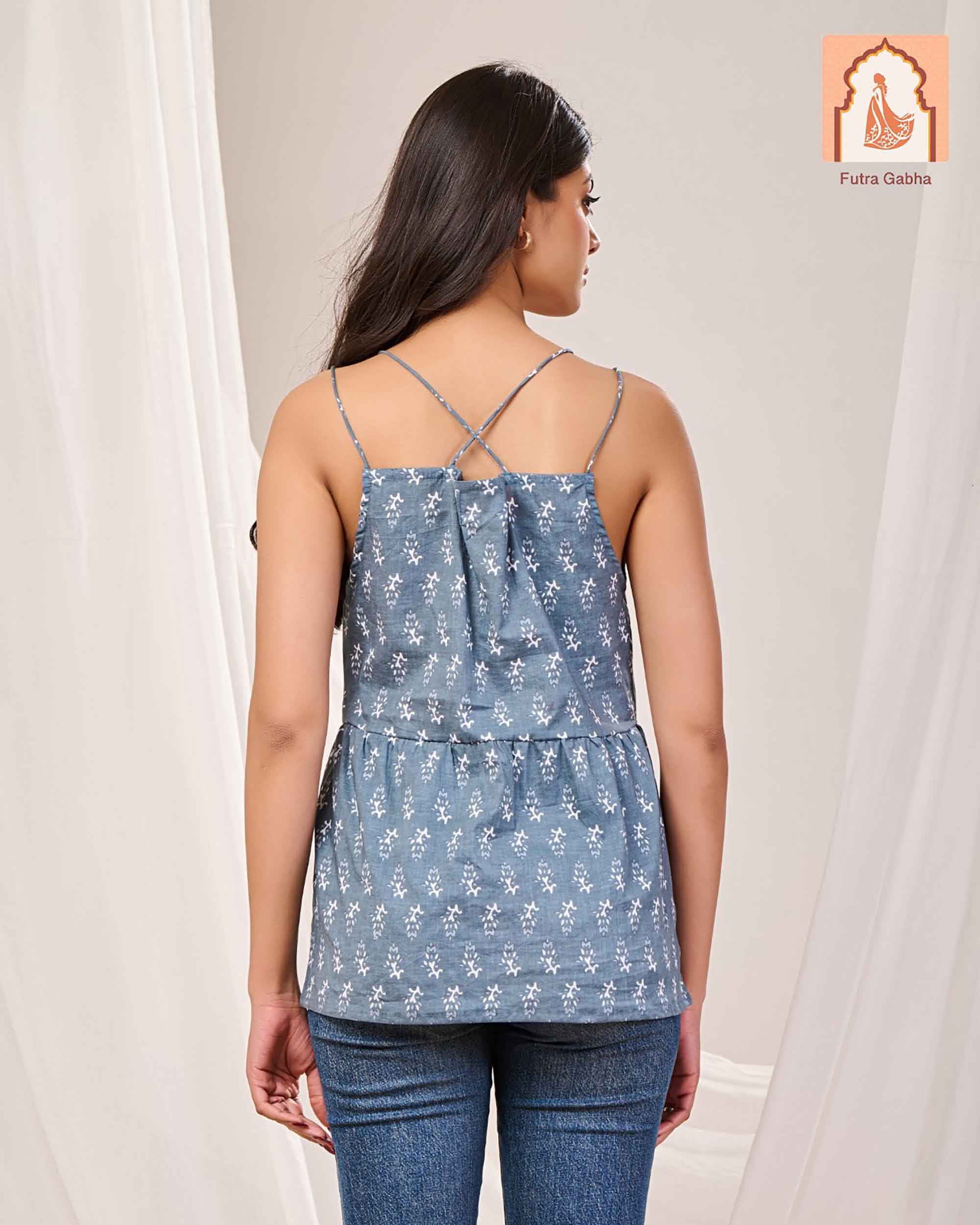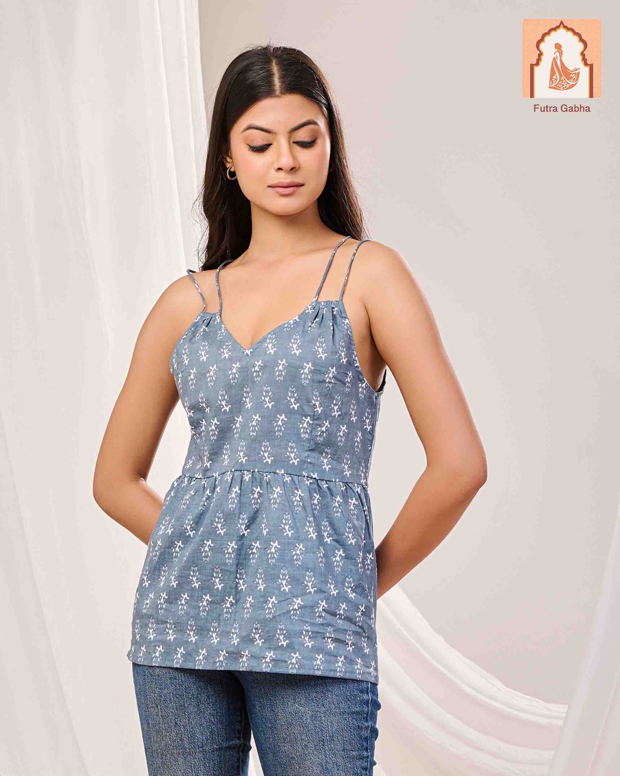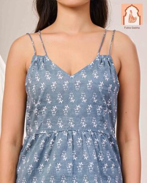 SKU: KK-T009 Category: short kurta Tags: Matte Cotton-like finish, Regular Fit, Slate Grey/Blue with White accents, Sleeveless with Dual Spaghetti Straps, trappy Spaghetti Top, v neck, Women's Short Kurta/Top