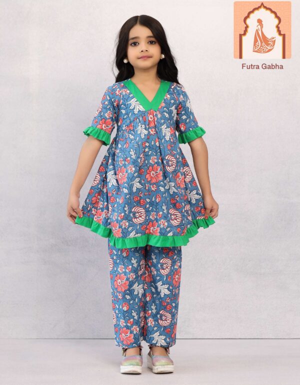 Blue Printed Floral Cotton Top and Pant Set for Girls (Set of 2)